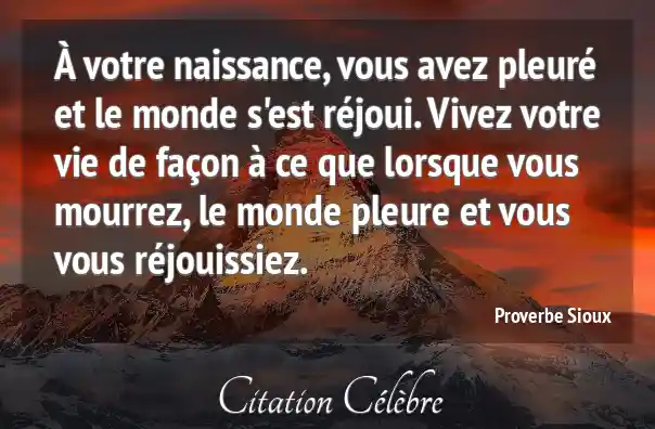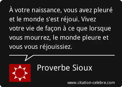 À votre naissance, vous avez pleuré et le monde s'est réjoui. Vivez votre vie de façon à ce que lorsque vous mourrez, le monde pleure et vous vous réjouissiez.