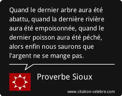 Quand le dernier arbre aura été abattu, quand la dernière rivière aura été empoisonnée, quand le dernier poisson aura été péché, alors enfin nous saurons que l'argent ne se mange pas.