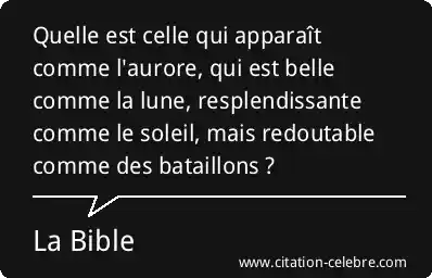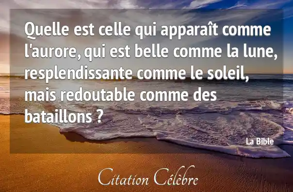 Quelle est celle qui apparaît comme l'aurore, qui est belle comme la lune, resplendissante comme le soleil, mais redoutable comme des bataillons ?
