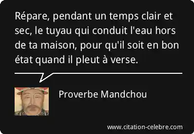 Répare, pendant un temps clair et sec, le tuyau qui conduit l'eau hors de ta maison, pour qu'il soit en bon état quand il pleut à verse.
