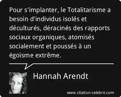 Pour s'implanter, le Totalitarisme a besoin d'individus isolés et déculturés, déracinés des rapports sociaux organiques, atomisés socialement et poussés à un égoïsme extrême.