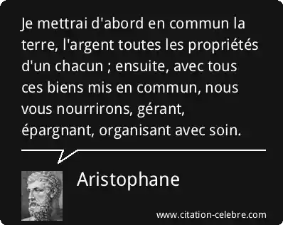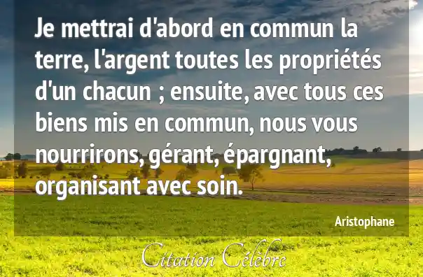 Je mettrai d'abord en commun la terre, l'argent toutes les propriétés d'un chacun ; ensuite, avec tous ces biens mis en commun, nous vous nourrirons, gérant, épargnant, organisant avec soin.