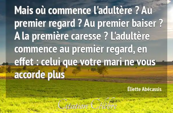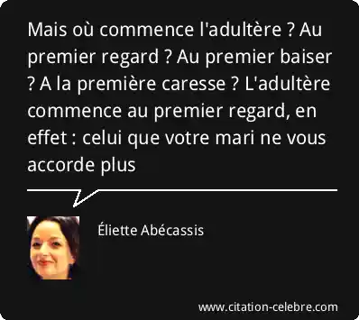 Mais où commence l'adultère ? Au premier regard ? Au premier baiser ? A la première caresse ? L'adultère commence au premier regard, en effet : celui que votre mari ne vous accorde plus