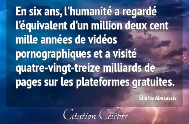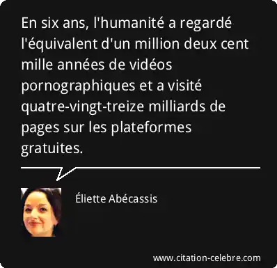 En six ans, l'humanité a regardé l'équivalent d'un million deux cent mille années de vidéos pornographiques et a visité quatre-vingt-treize milliards de pages sur les plateformes gratuites.
