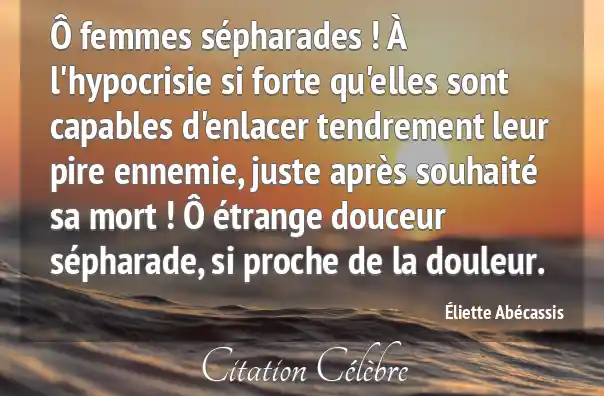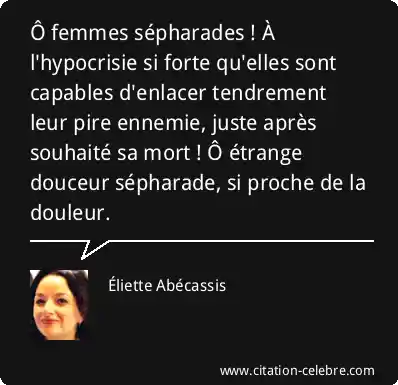 Ô femmes sépharades ! À l'hypocrisie si forte qu'elles sont capables d'enlacer tendrement leur pire ennemie, juste après souhaité sa mort ! Ô étrange douceur sépharade, si proche de la douleur.