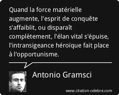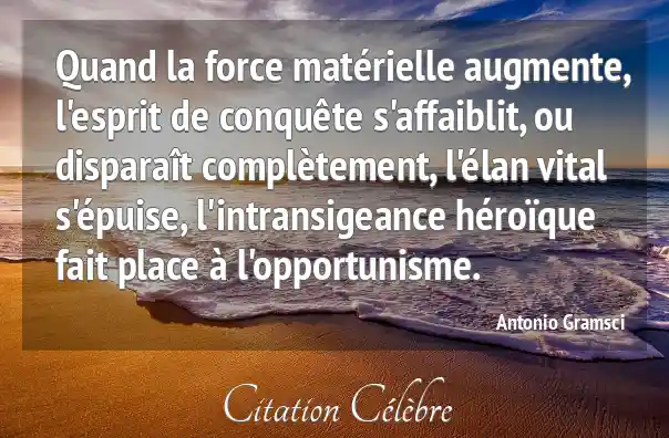 Quand la force matérielle augmente, l'esprit de conquête s'affaiblit, ou disparaît complètement, l'élan vital s'épuise, l'intransigeance héroïque fait place à l'opportunisme.