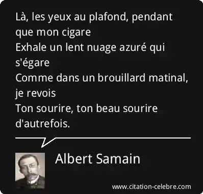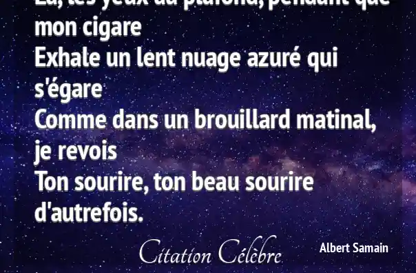 Là, les yeux au plafond, pendant que mon cigareExhale un lent nuage azuré qui s'égareComme dans un brouillard matinal, je revoisTon sourire, ton beau sourire d'autrefois.
