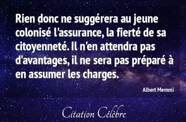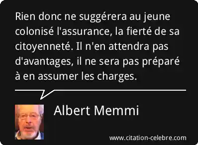 Rien donc ne suggérera au jeune colonisé l'assurance, la fierté de sa citoyenneté. Il n'en attendra pas d'avantages, il ne sera pas préparé à en assumer les charges.