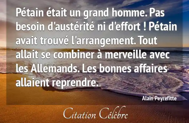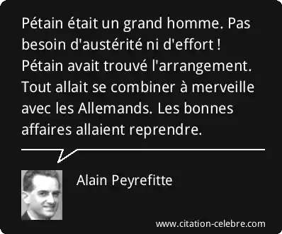 Pétain était un grand homme. Pas besoin d'austérité ni d'effort ! Pétain avait trouvé l'arrangement. Tout allait se combiner à merveille avec les Allemands. Les bonnes affaires allaient reprendre.