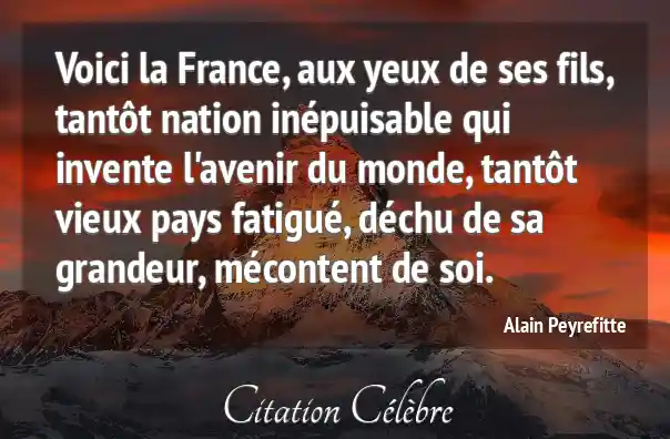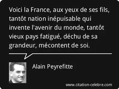 Voici la France, aux yeux de ses fils, tantôt nation inépuisable qui invente l'avenir du monde, tantôt vieux pays fatigué, déchu de sa grandeur, mécontent de soi.