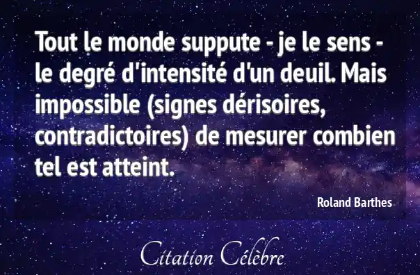 Tout le monde suppute - je le sens - le degré d'intensité d'un deuil. Mais impossible (signes dérisoires, contradictoires) de mesurer combien tel est atteint.