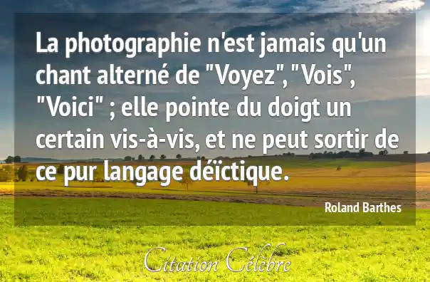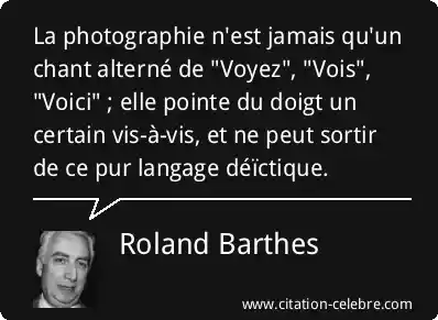 La photographie n'est jamais qu'un chant alterné de "Voyez", "Vois", "Voici" ; elle pointe du doigt un certain vis-à-vis, et ne peut sortir de ce pur langage déïctique.