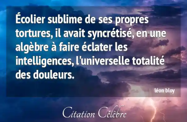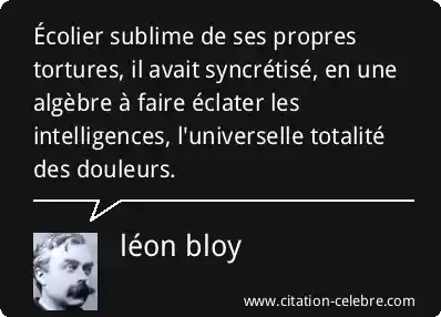 Écolier sublime de ses propres tortures, il avait syncrétisé, en une algèbre à faire éclater les intelligences, l'universelle totalité des douleurs.