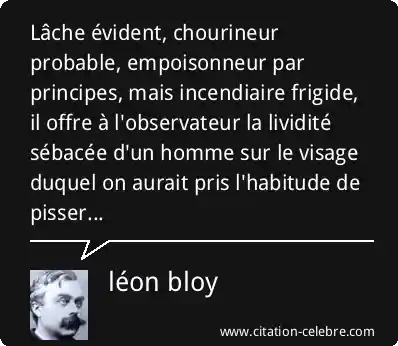 Lâche évident, chourineur probable, empoisonneur par principes, mais incendiaire frigide, il offre à l'observateur la lividité sébacée d'un homme sur le visage duquel on aurait pris l'habitude de pisser...
