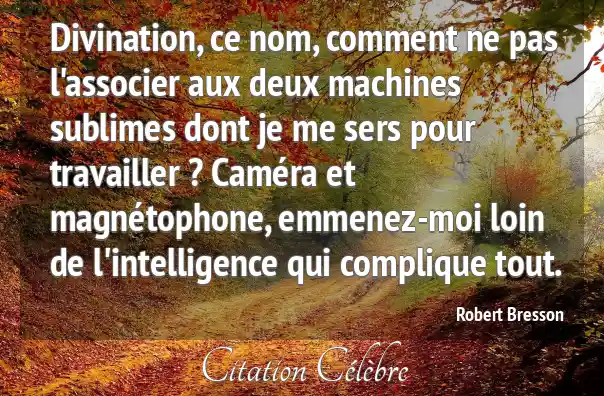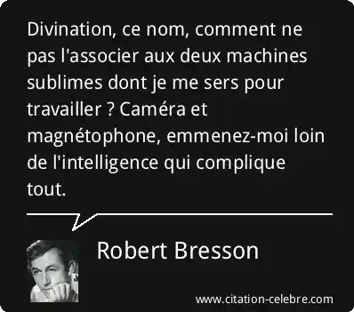 Divination, ce nom, comment ne pas l'associer aux deux machines sublimes dont je me sers pour travailler ? Caméra et magnétophone, emmenez-moi loin de l'intelligence qui complique tout.