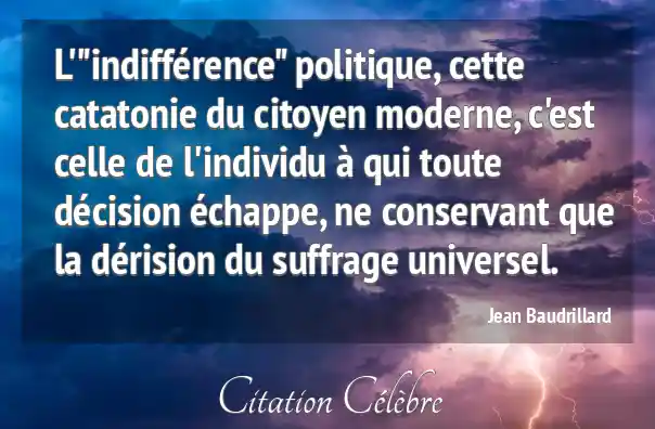 L'"indifférence" politique, cette catatonie du citoyen moderne, c'est celle de l'individu à qui toute décision échappe, ne conservant que la dérision du suffrage universel.