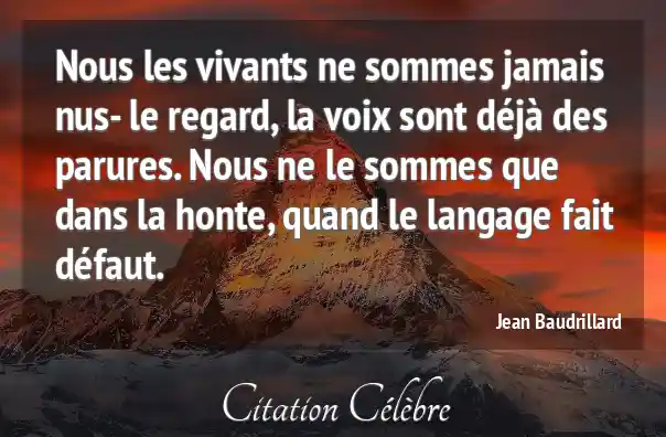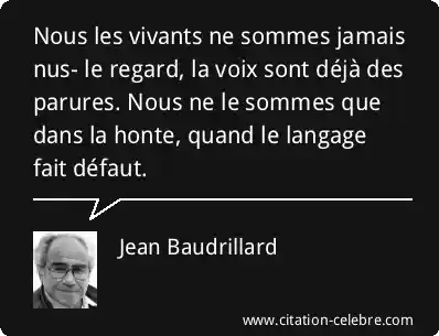 Nous les vivants ne sommes jamais nus- le regard, la voix sont déjà des parures. Nous ne le sommes que dans la honte, quand le langage fait défaut.