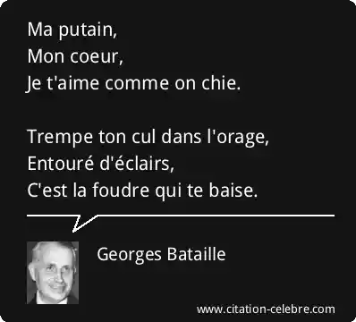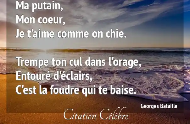 Ma putain,Mon coeur,Je t'aime comme on chie.Trempe ton cul dans l'orage,Entouré d'éclairs,C'est la foudre qui te baise.