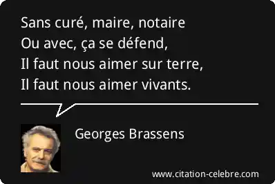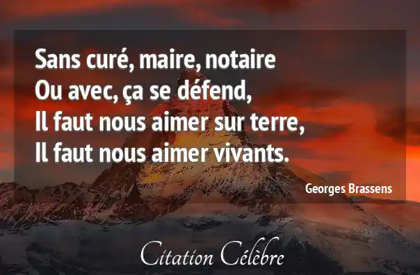 Sans curé, maire, notaireOu avec, ça se défend,Il faut nous aimer sur terre,Il faut nous aimer vivants.