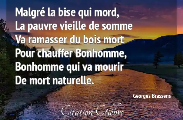 Malgré la bise qui mord,La pauvre vieille de sommeVa ramasser du bois mortPour chauffer Bonhomme,Bonhomme qui va mourirDe mort naturelle.