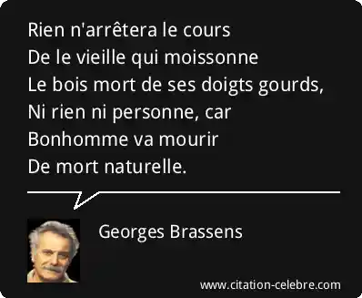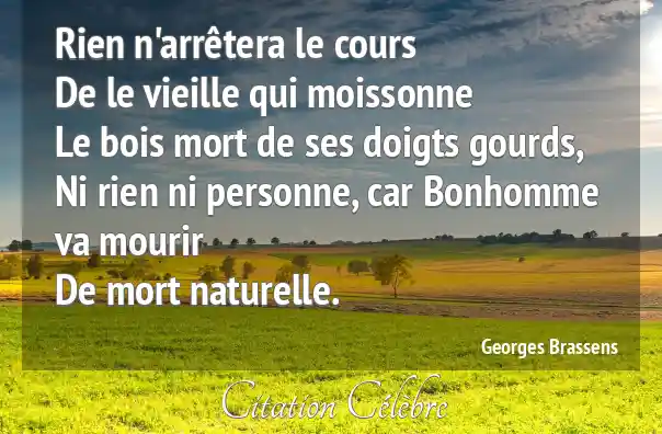 Rien n'arrêtera le coursDe le vieille qui moissonneLe bois mort de ses doigts gourds,Ni rien ni personne, car Bonhomme va mourirDe mort naturelle.