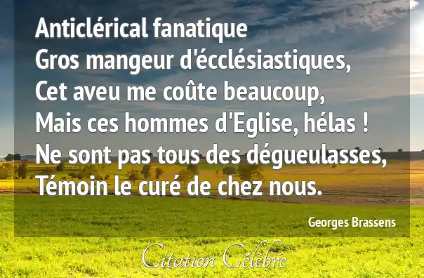 Anticlérical fanatiqueGros mangeur d'écclésiastiques,Cet aveu me coûte beaucoup,Mais ces hommes d'Eglise, hélas !Ne sont pas tous des dégueulasses,Témoin le curé de chez nous.