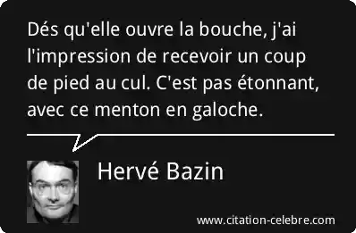 Dés qu'elle ouvre la bouche, j'ai l'impression de recevoir un coup de pied au cul. C'est pas étonnant, avec ce menton en galoche.