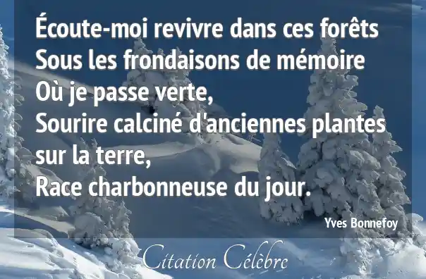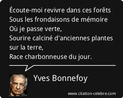 Écoute-moi revivre dans ces forêtsSous les frondaisons de mémoireOù je passe verte,Sourire calciné d'anciennes plantes sur la terre,Race charbonneuse du jour.