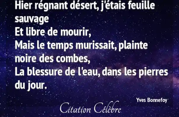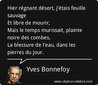 Hier régnant désert, j'étais feuille sauvageEt libre de mourir,Mais le temps murissait, plainte noire des combes,La blessure de l'eau, dans les pierres du jour.