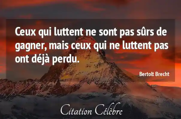 Cette puissante formule de Bertolt Brecht exprime l'idée que l'action, même face à l'incertitude du succès, est la seule voie possible pour obtenir un changement ou atteindre un objectif. Elle oppose la possibilité de la victoire, qui réside dans le combat, à la certitude de l'échec, qui est le prix de la résignation.