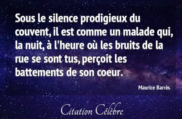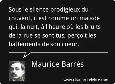 Sous le silence prodigieux du couvent, il est comme un malade qui, la nuit, à l'heure où les bruits de la rue se sont tus, perçoit les battements de son coeur.