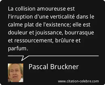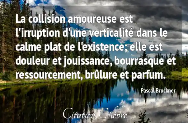 La collision amoureuse est l'irruption d'une verticalité dans le calme plat de l'existence; elle est douleur et jouissance, bourrasque et ressourcement, brûlure et parfum.