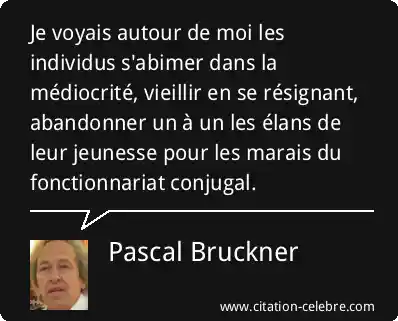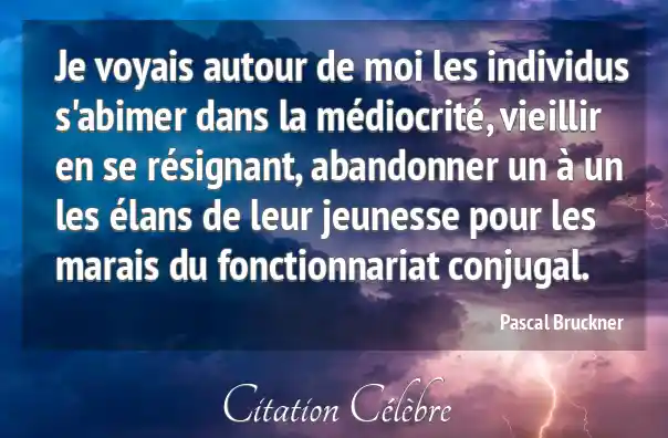 Je voyais autour de moi les individus s'abimer dans la médiocrité, vieillir en se résignant, abandonner un à un les élans de leur jeunesse pour les marais du fonctionnariat conjugal.