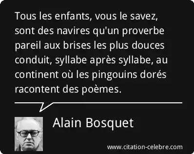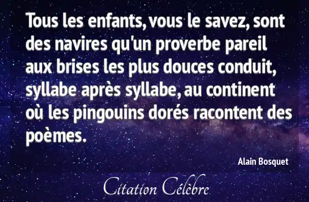 Tous les enfants, vous le savez, sont des navires qu'un proverbe pareil aux brises les plus douces conduit, syllabe après syllabe, au continent où les pingouins dorés racontent des poèmes.
