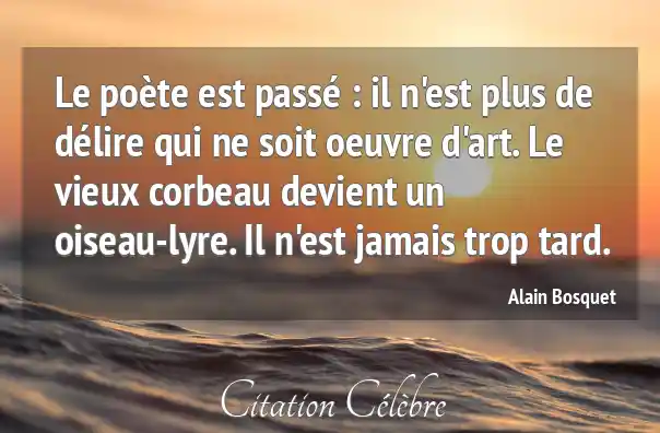Le poète est passé : il n'est plus de délire qui ne soit oeuvre d'art. Le vieux corbeau devient un oiseau-lyre. Il n'est jamais trop tard.
