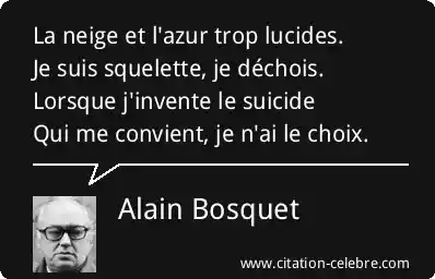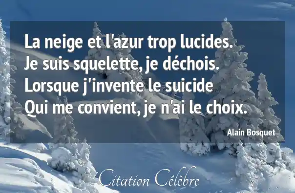 La neige et l'azur trop lucides.Je suis squelette, je déchois.Lorsque j'invente le suicideQui me convient, je n'ai le choix.