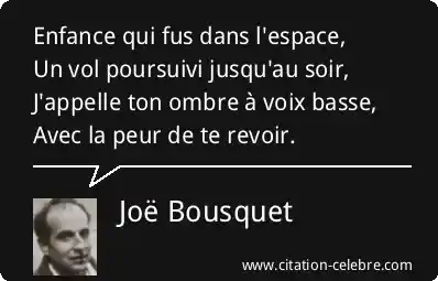 Enfance qui fus dans l'espace,Un vol poursuivi jusqu'au soir,J'appelle ton ombre à voix basse,Avec la peur de te revoir.