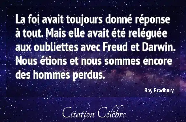 La foi avait toujours donné réponse à tout. Mais elle avait été reléguée aux oubliettes avec Freud et Darwin. Nous étions et nous sommes encore des hommes perdus.