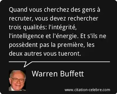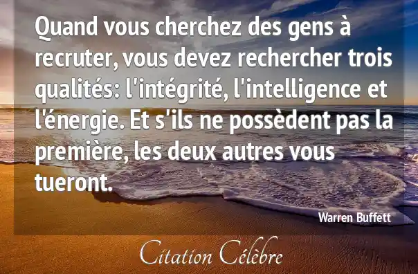 Quand vous cherchez des gens à recruter, vous devez rechercher trois qualités: l'intégrité, l'intelligence et l'énergie. Et s'ils ne possèdent pas la première, les deux autres vous tueront.