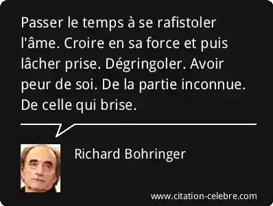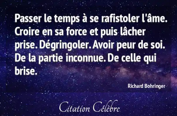 Passer le temps à se rafistoler l'âme. Croire en sa force et puis lâcher prise. Dégringoler. Avoir peur de soi. De la partie inconnue. De celle qui brise.