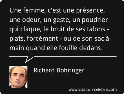 Une femme, c'est une présence, une odeur, un geste, un poudrier qui claque, le bruit de ses talons - plats, forcément - ou de son sac à main quand elle fouille dedans.