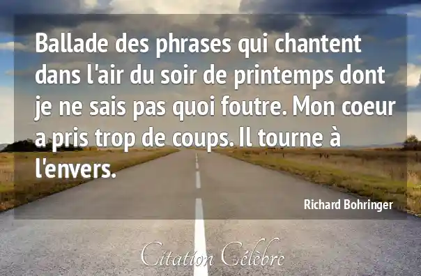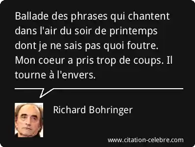 Ballade des phrases qui chantent dans l'air du soir de printemps dont je ne sais pas quoi foutre. Mon coeur a pris trop de coups. Il tourne à l'envers.