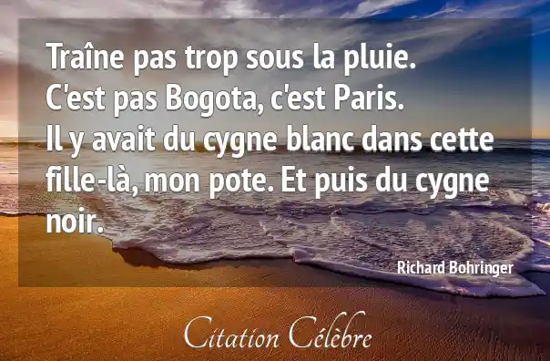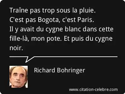Traîne pas trop sous la pluie.C'est pas Bogota, c'est Paris.Il y avait du cygne blanc dans cette fille-là, mon pote. Et puis du cygne noir.