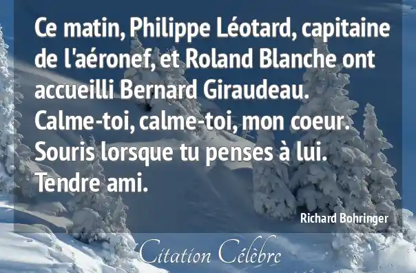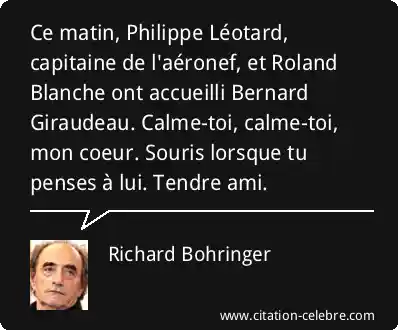 Ce matin, Philippe Léotard, capitaine de l'aéronef, et Roland Blanche ont accueilli Bernard Giraudeau. Calme-toi, calme-toi, mon coeur. Souris lorsque tu penses à lui. Tendre ami.