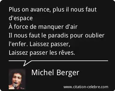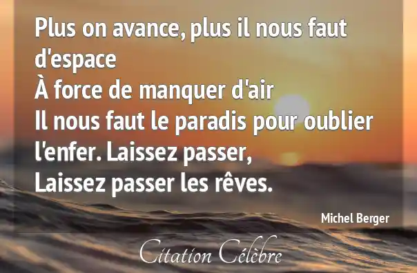 Plus on avance, plus il nous faut d'espaceÀ force de manquer d'airIl nous faut le paradis pour oublierl'enfer. Laissez passer,Laissez passer les rêves.