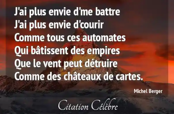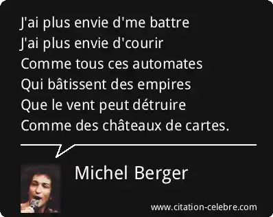 J'ai plus envie d'me battreJ'ai plus envie d'courirComme tous ces automatesQui bâtissent des empiresQue le vent peut détruireComme des châteaux de cartes.