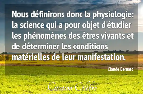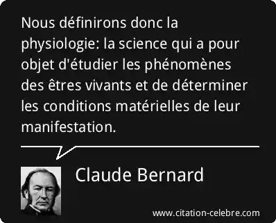 Nous définirons donc la physiologie: la science qui a pour objet d'étudier les phénomènes des êtres vivants et de déterminer les conditions matérielles de leur manifestation.