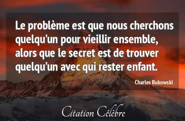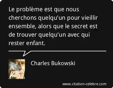 - Pour Bukowski, l'objectif ne serait pas la maturité ou la sécurité, mais plutôt la capacité à maintenir l'esprit d'enfance au sein de la relation : la spontanéité, l'insouciance, le jeu, l'émerveillement et une certaine forme de folie joyeuse.