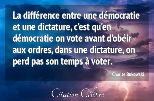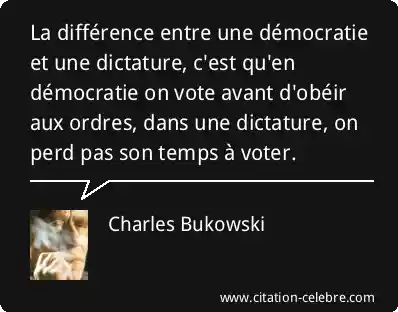 La différence entre une démocratie et une dictature, c'est qu'en démocratie on vote avant d'obéir aux ordres, dans une dictature, on perd pas son temps à voter.