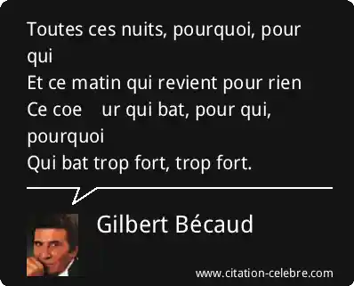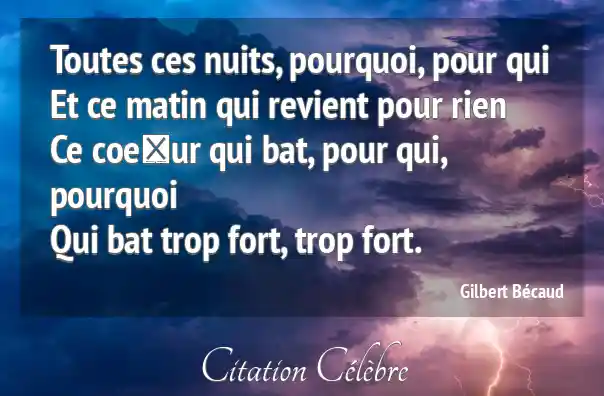 Toutes ces nuits, pourquoi, pour quiEt ce matin qui revient pour rienCe coeœur qui bat, pour qui, pourquoiQui bat trop fort, trop fort.